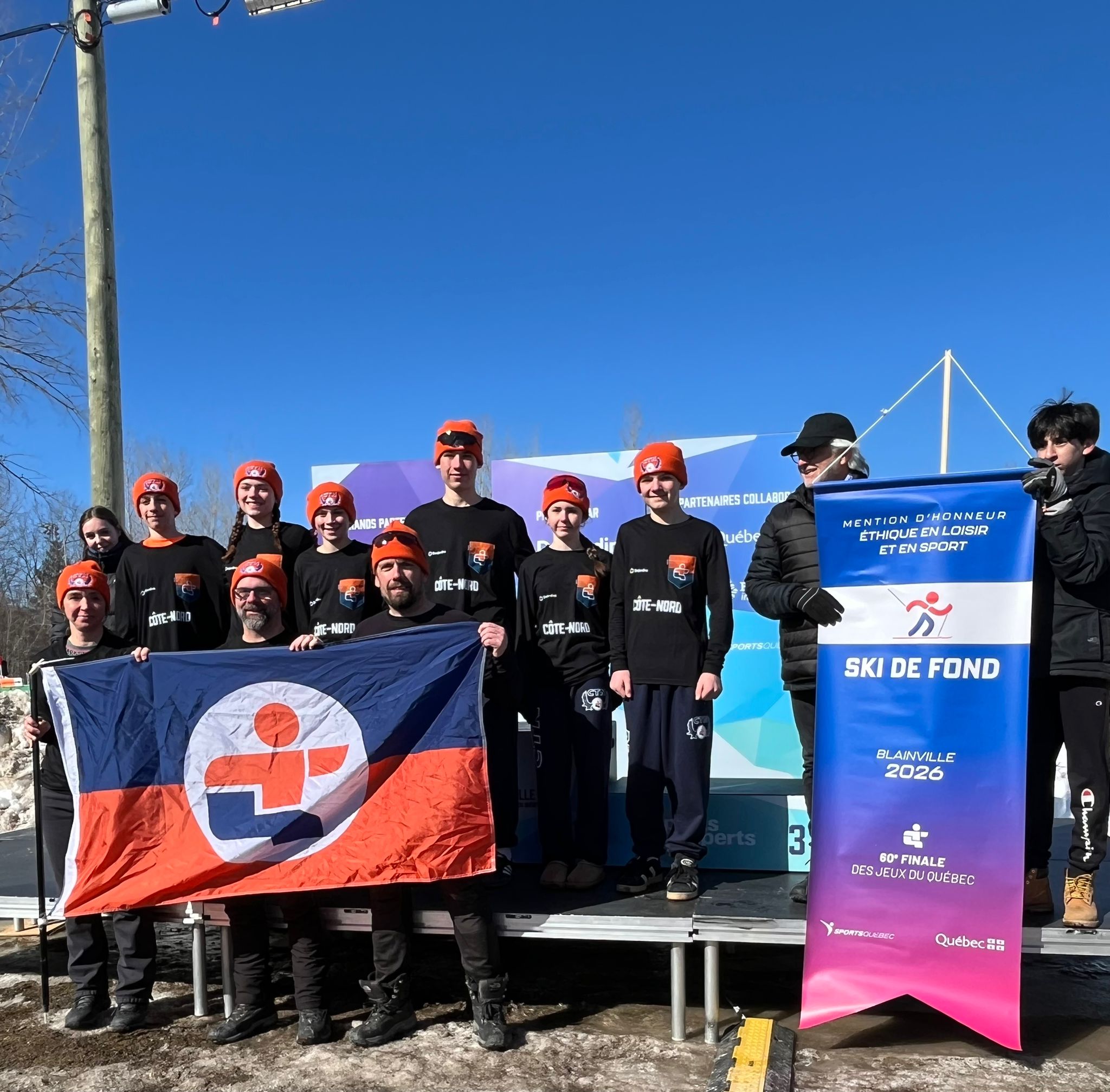 L’équipe de ski de fond de la Côte-Nord a gagné la bannière d’éthique en loisir et sport. (Photo Jeux du Québec - Région Côte-Nord) La délégation Côte-Nord s’est vue remettre hier deux bannières pour éthique sportive aux Jeux du Québec à Blainville. Nos jeunes athlètes en ski de fond et en gymnastique se distinguent par un comportement exemplaire et leurs efforts.